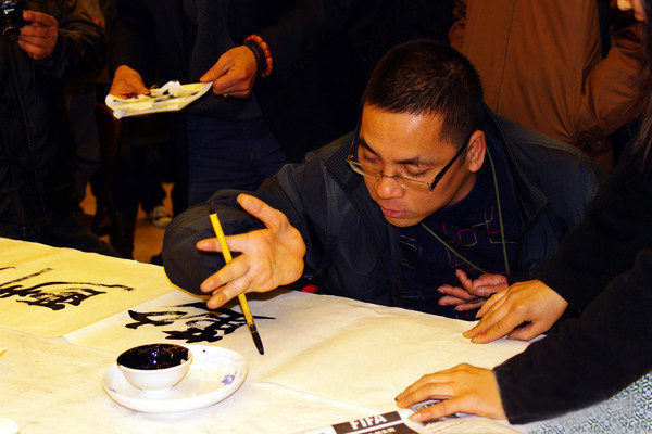 △王渊鹏在“心相约 梦闪耀”残疾人文联书画名家邀请展活动现场创作书法作品